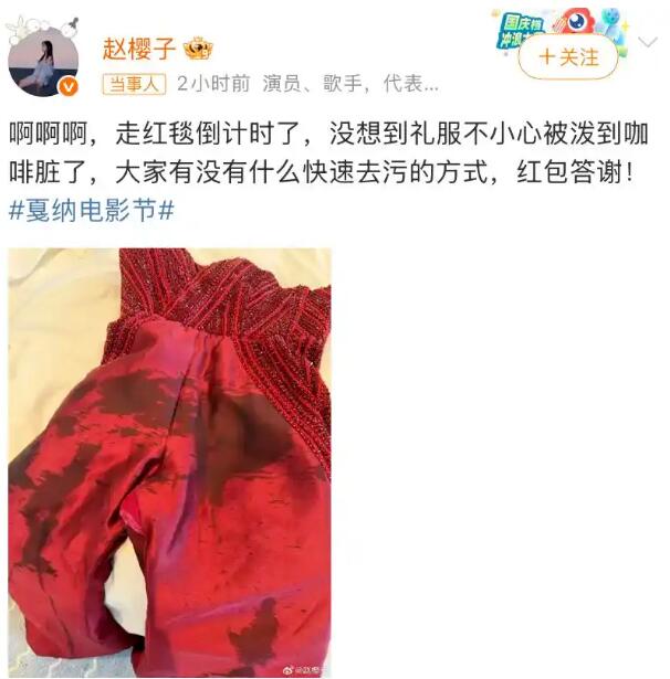 5月13日晚,演员赵樱子在参加第77届戛纳电影节红毯前遭遇突发状况,其精心准备的礼服被咖啡泼洒,导致面料出现大面积污渍。面对这一意外,赵樱子紧急通过微博发文求助:“大家有没有什么快速去污的方式,红包答谢!”这一突发事件迅速引发网友热议,相关话题迅速登上热搜。
